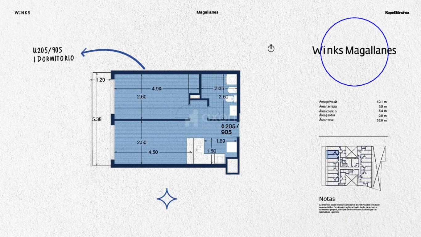 La unidad 905 se desarrolla en 46,6m2 dividiéndose 40,1m2 en superficie interna y 6,5m2 en terraza. Esta unidad cuenta con 1 dormitorio, cocina integrada al living y 1 baño. También cuenta con un balcón.